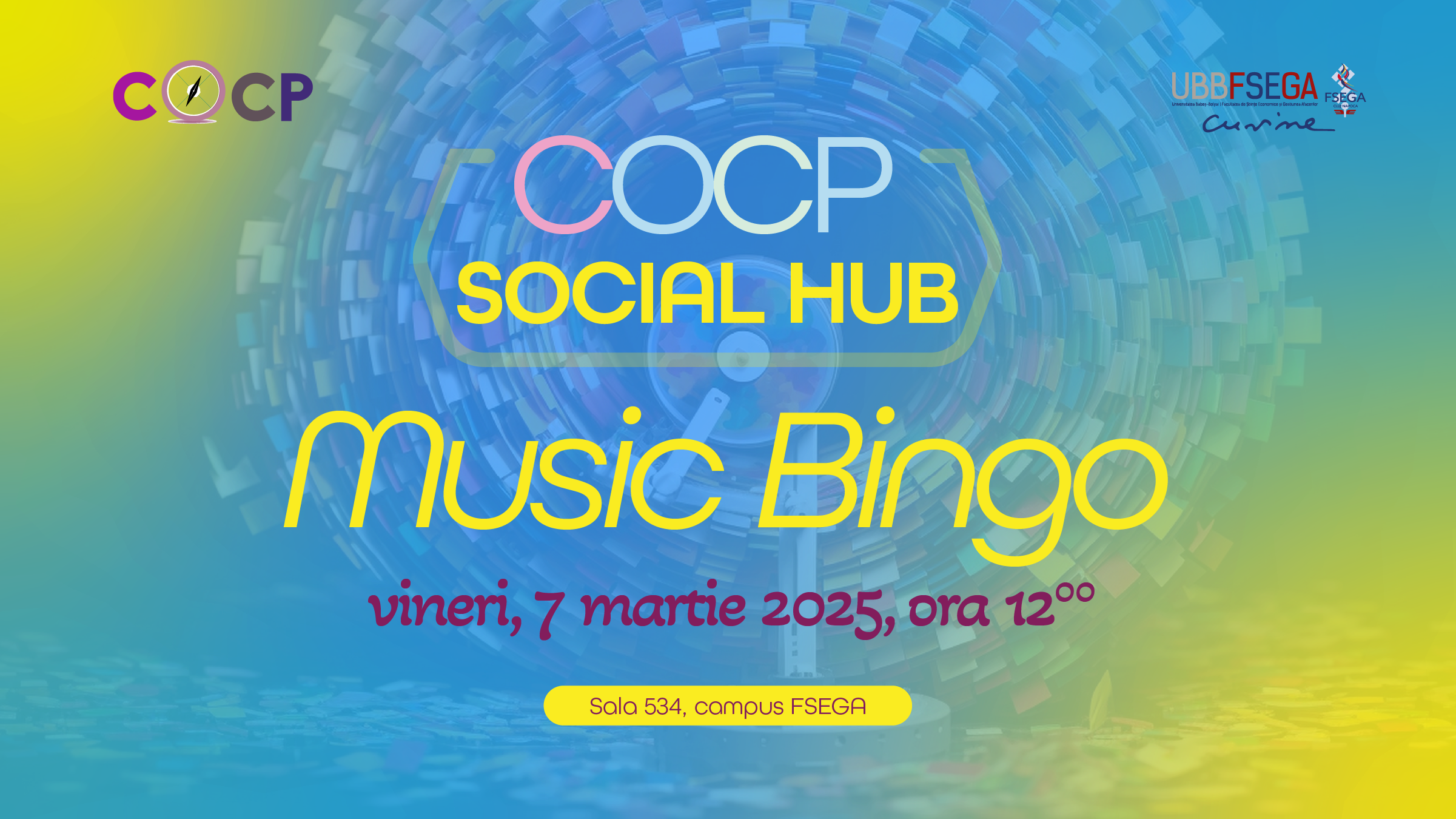Centrul de Orientare și Consiliere Profesională din cadrul FSEGA invită studenții facultății la un nou eveniment marca COCP Social Hub, și anume Music BINGO care va avea loc vineri (7 martie) de la ora 12:00.