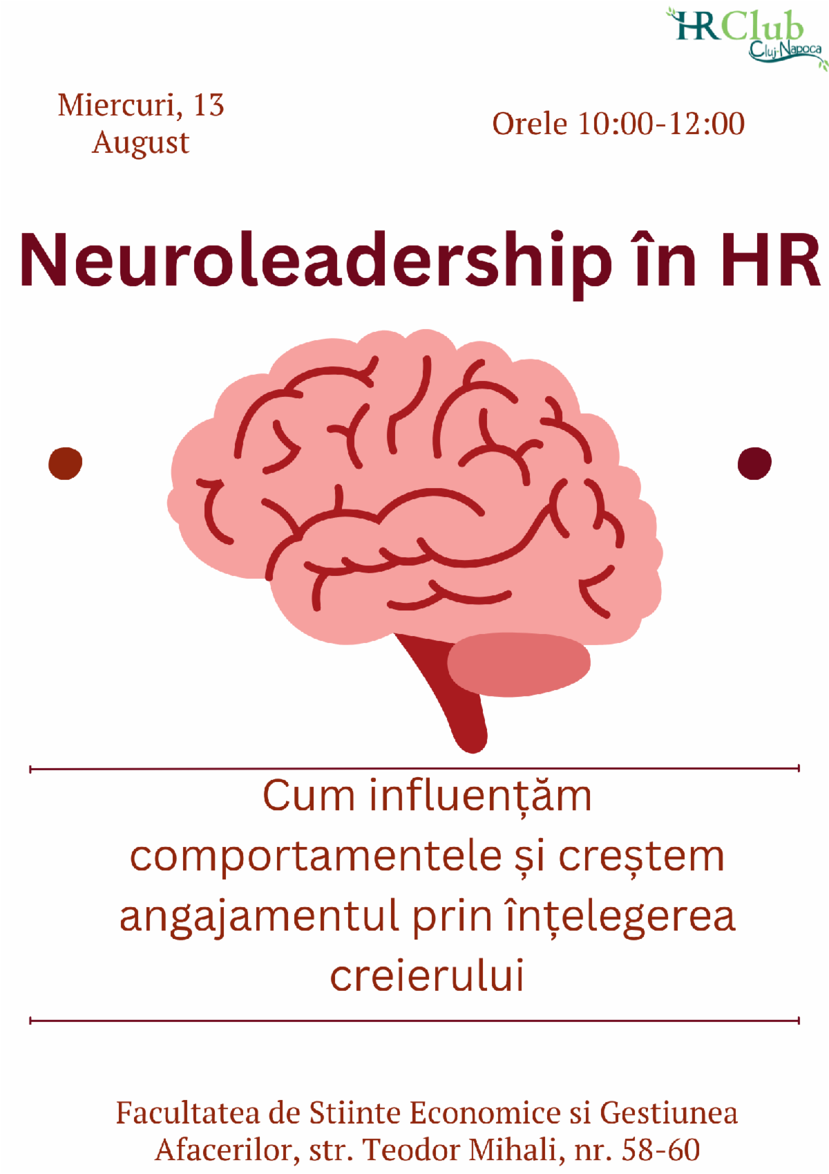 Miercuri, 13 august, orele 10:00 – 12:00, găzduim un nou workshop dedicat profesioniștilor în resurse umane organizat de către HR Club, cu tema Neuroleadership în HR: Cum influențăm comportamentele și creștem angajamentul prin înțelegerea creierului.