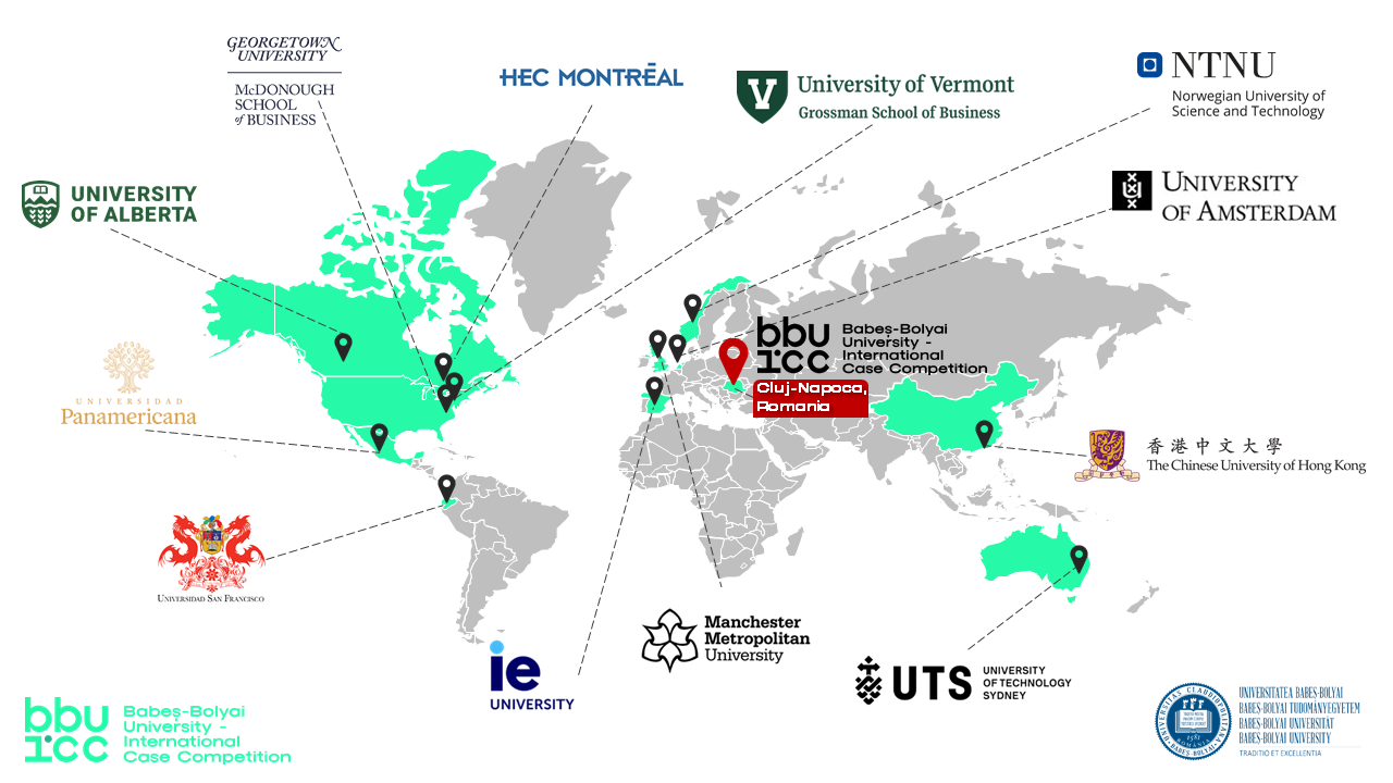 Cele 12 universități participante la prima ediție a BBU-ICC vor fi: Georgetown University (SUA), HEC Montreal (Canada), IE University (Spania), Manchester Metropolitan University (UK), Norwegian University of Science and Technology (Norvegia), University of Alberta (SUA), University of Amsterdam (Olanda), Universidad Panamericana (Mexic), Universidad San Fransisco de Quito (Ecuador), University of Technology Sydney (Australia), University of Vermont (SUA), The Chinese University of Hong Kong (China).