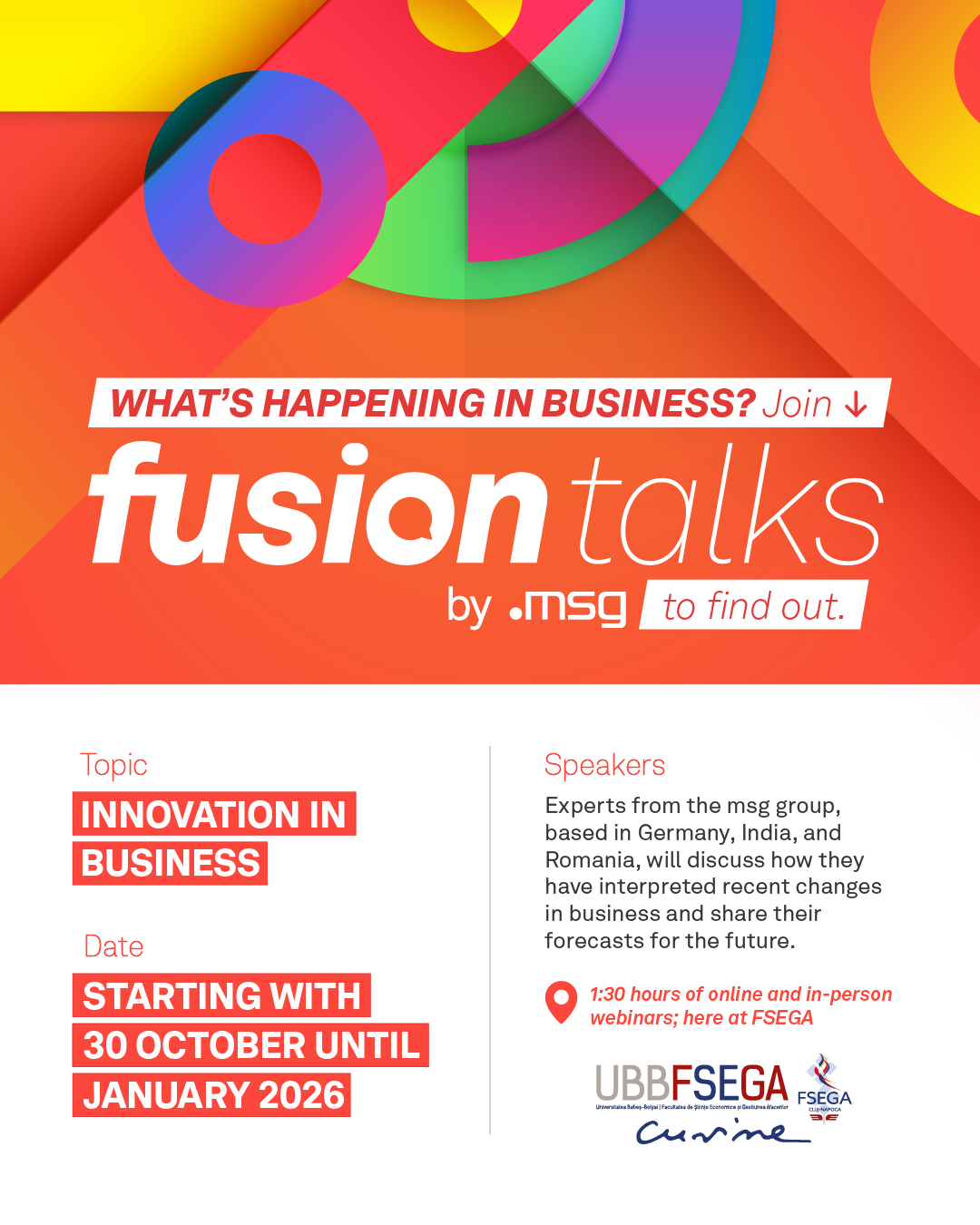 ๐ฎ๐ฌ๐ข๐จ๐ง ๐๐๐ฅ๐ค๐ฌ - a series of interactive webinars developed through the collaboration between UBB-FSEGA and .๐ฆ๐ฌ๐ ๐๐จ๐ฆ๐ฬ๐ง๐ข๐ - brings academia and business together to share insights, explore new ideas, and inspire the next generation of leaders.