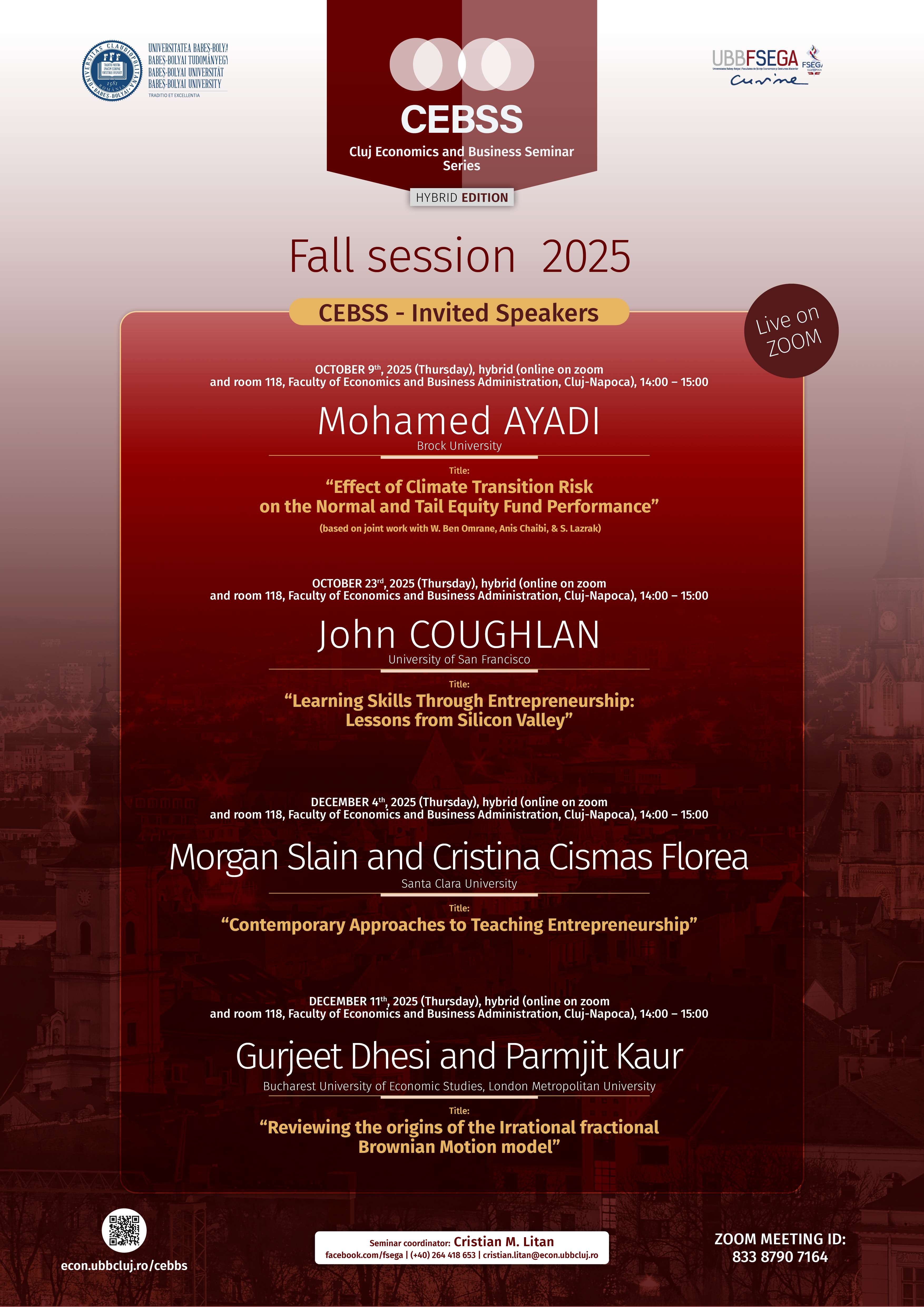 În data de 04 decembrie 2025, de la ora 14:00, Morgan Slain și Cristina Cismas Florea, de la Universitatea Santa Clara, vor susține o prezentare în cadrul ediției de toamnă a Cluj Economics and Business Seminar Series (CEBSS).