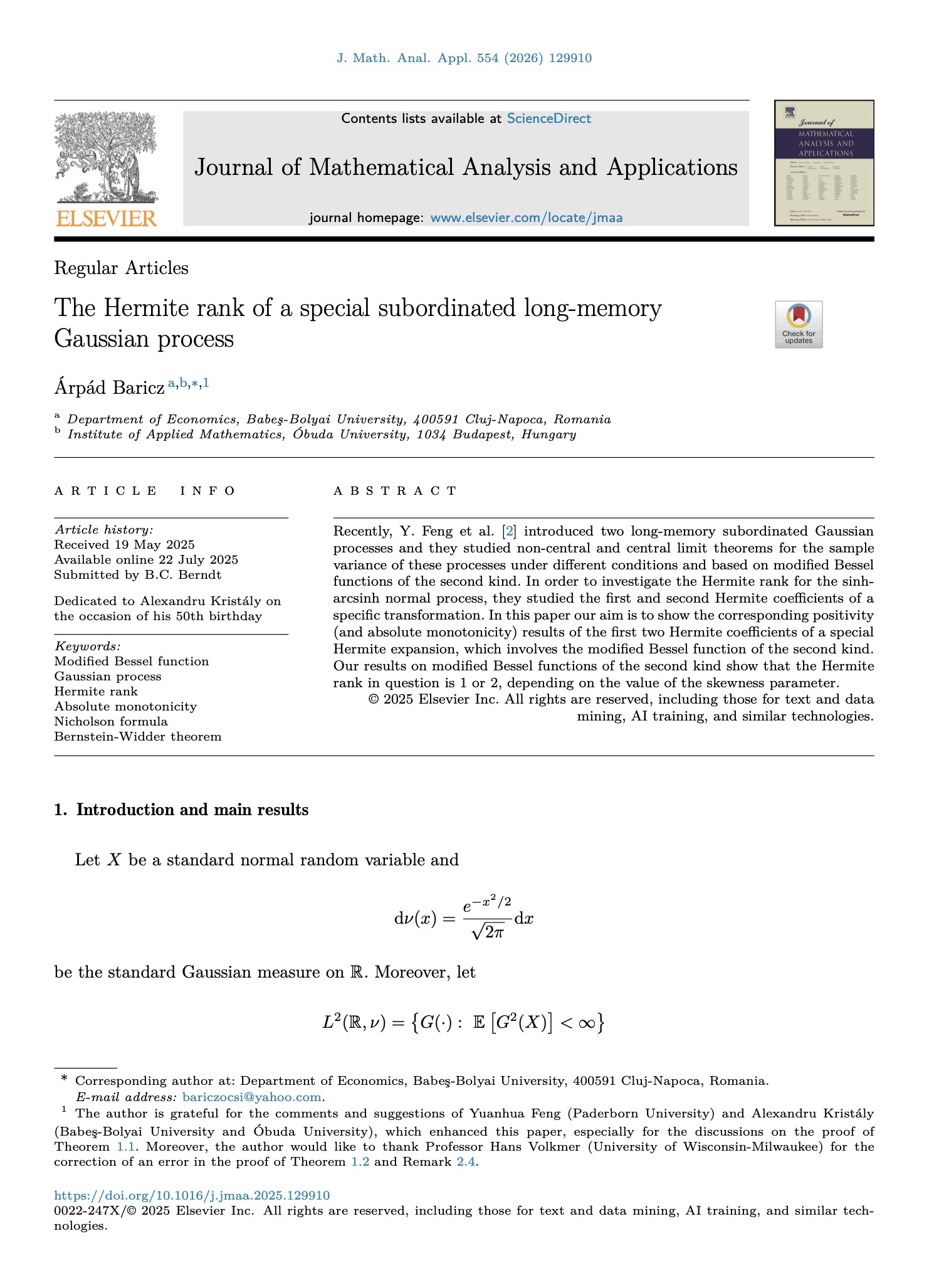 Baricz, A. (2026) The Hermite rank of a special subordinated long-memory Gaussian process. Journal of Mathematical Analysis and Applications, 554(1), 129910.