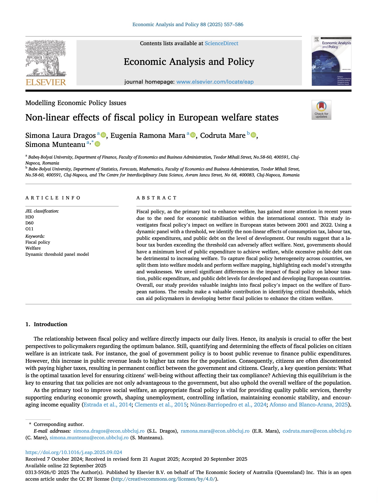 Dragos, S.L.; Mara, E.R.; Mare, C. & Munteanu, S. (2025) Non-linear effects of fiscal policy in European welfare states. Economic Analysis and Policy, 88, 557-586.