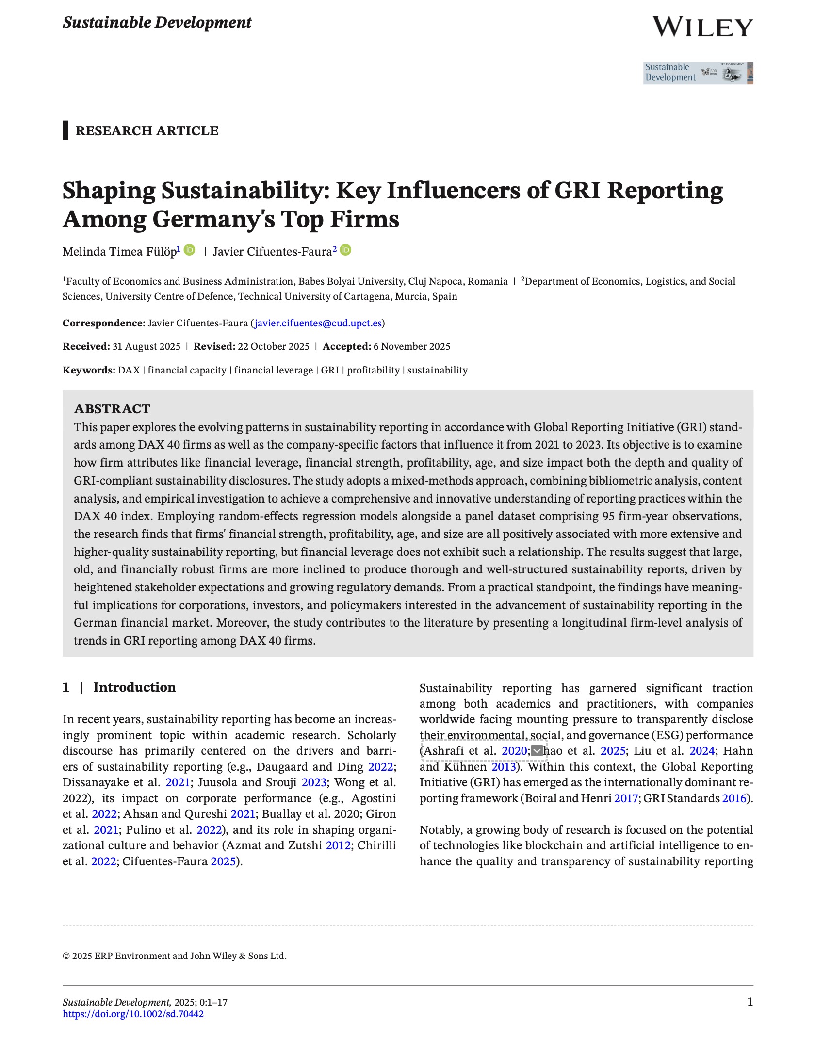Fülöp, M.T. & Cifuentes‐Faura, J. (In press) Shaping Sustainability: Key Influencers of GRI Reporting Among Germany's Top Firms. Sustainable Development .