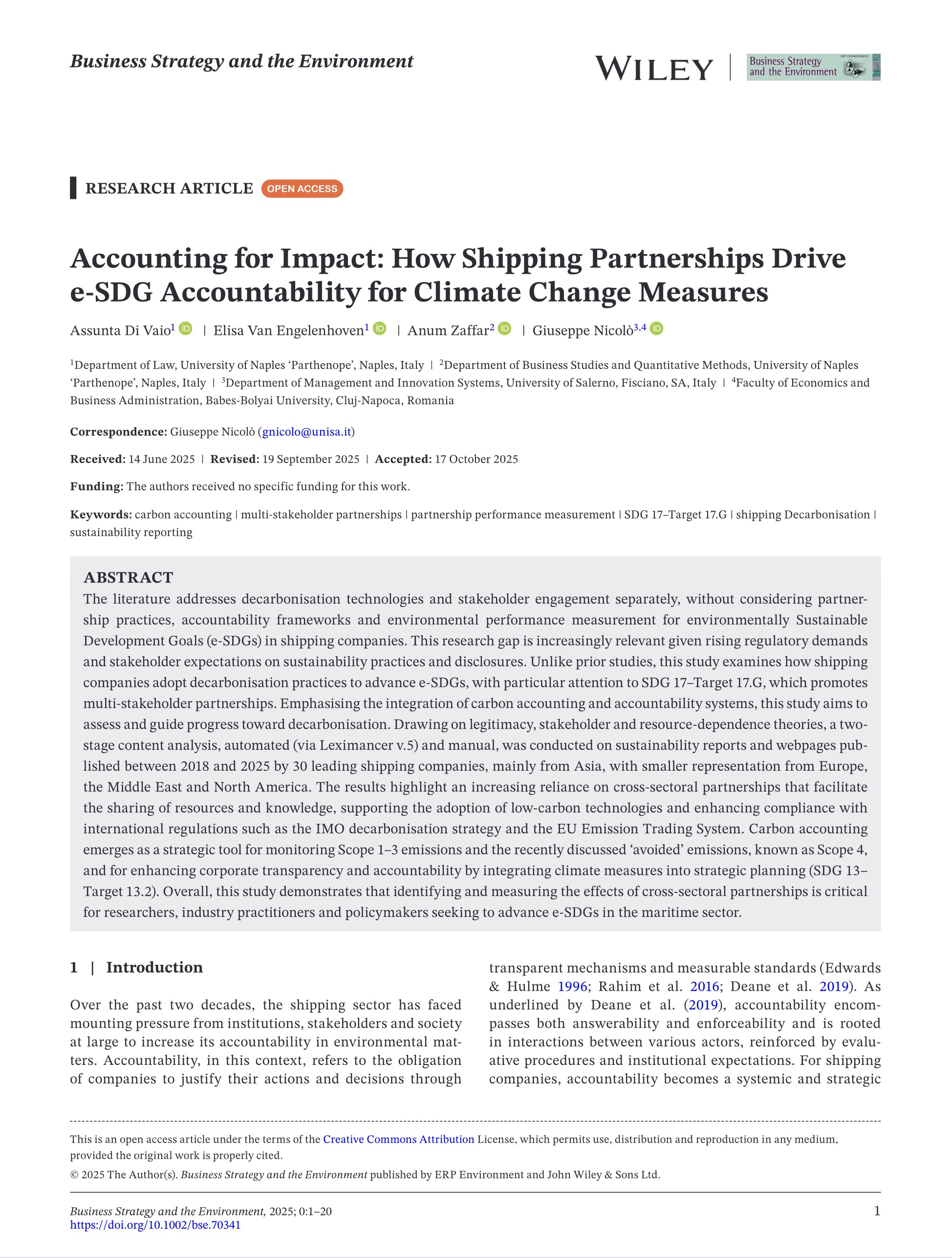 Di Vaio, A.; Van Engelenhoven, E.; Zaffar, A. & Nicolò, G. (In press) Accounting for Impact: How Shipping Partnerships Drive e-SDG Accountability for Climate Change Measures Business Strategy and the Environment .
