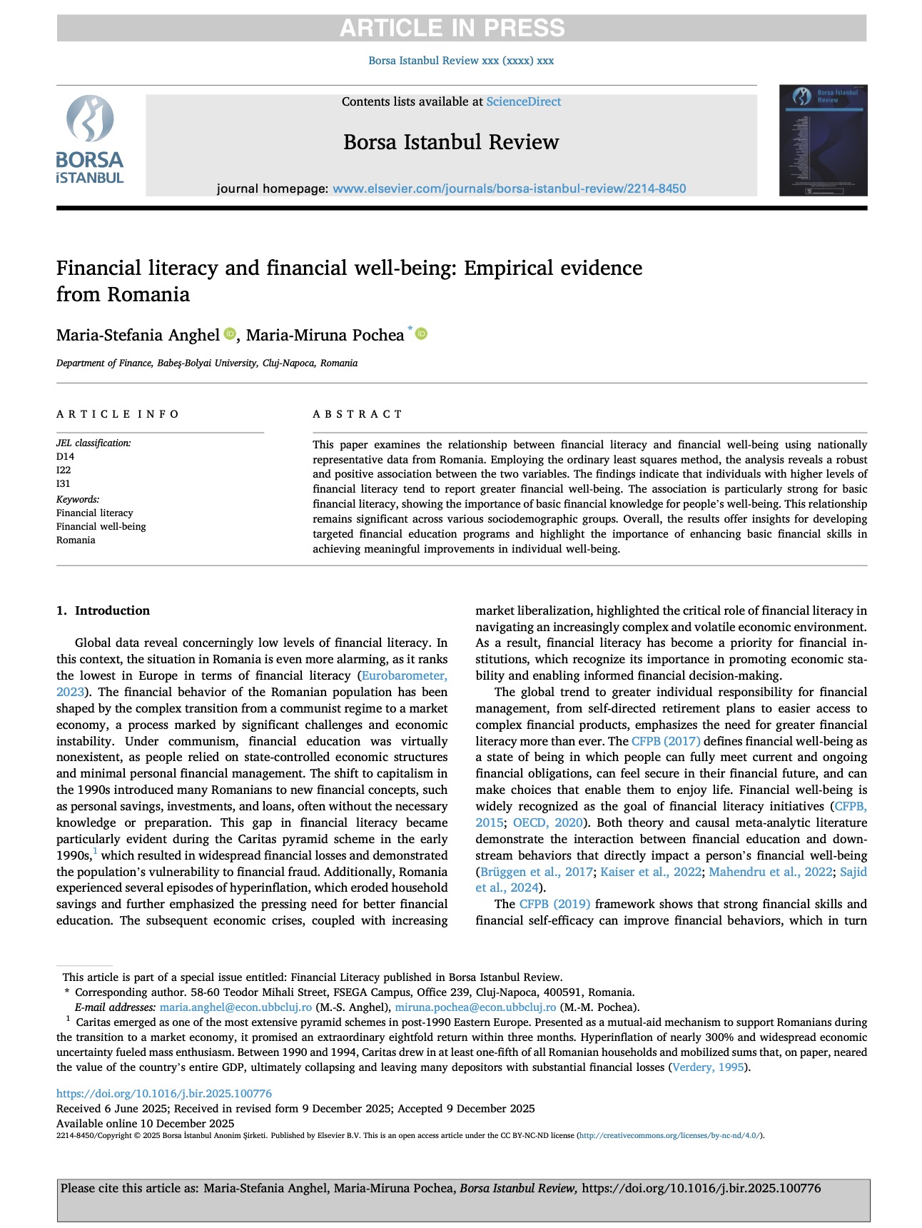 Anghel, M.S. & Pochea, M.M. (In press) Financial literacy and financial well-being: Empirical evidence from Romania. Borsa Istanbul Review.