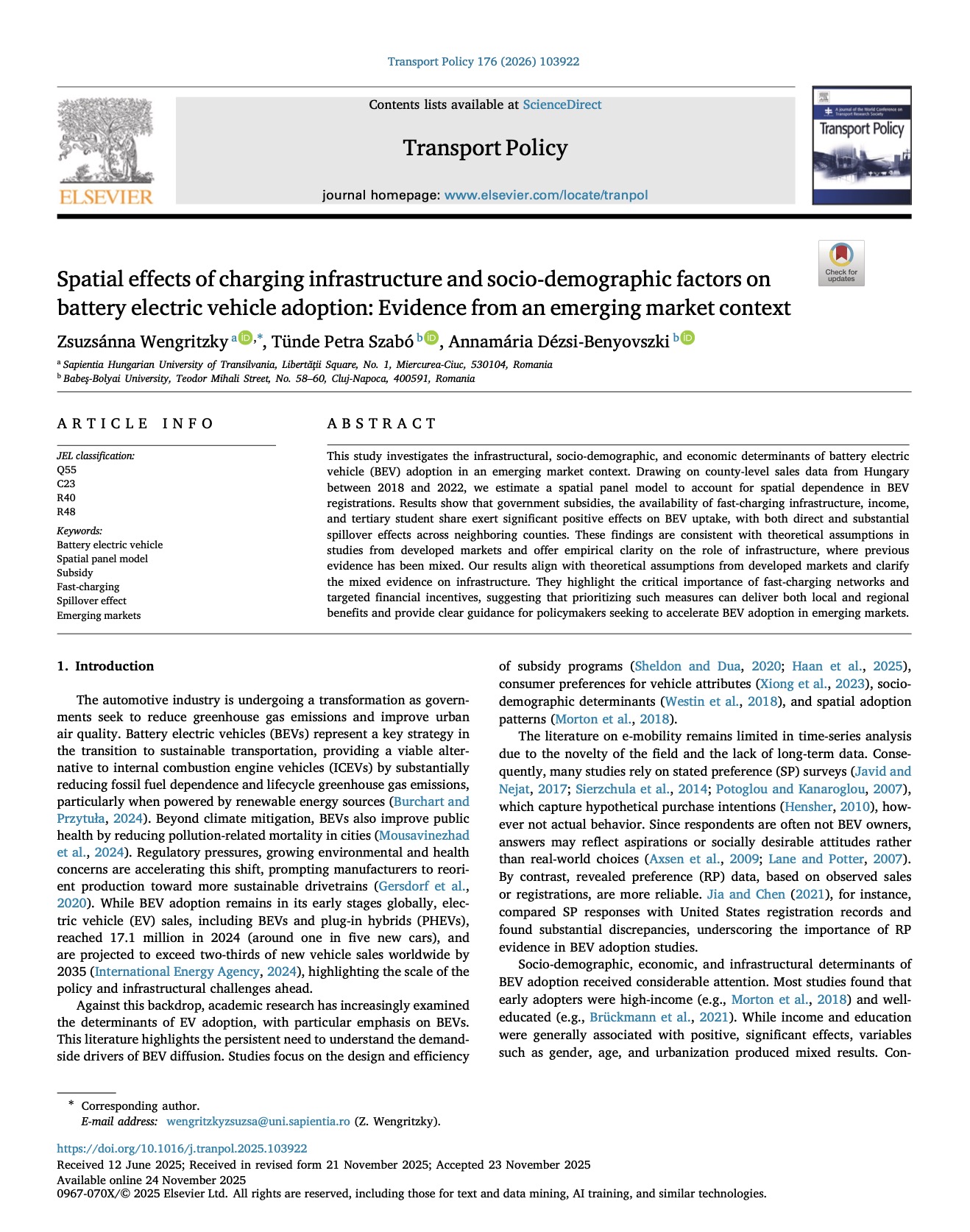 Wengritzky, Z.; Szabó, T.P. & Dézsi-Benyovszki, A. (2026) Spatial effects of charging infrastructure and socio-demographic factors on battery electric vehicle adoption: Evidence from an emerging market context. Transport Policy , 176, 103922.