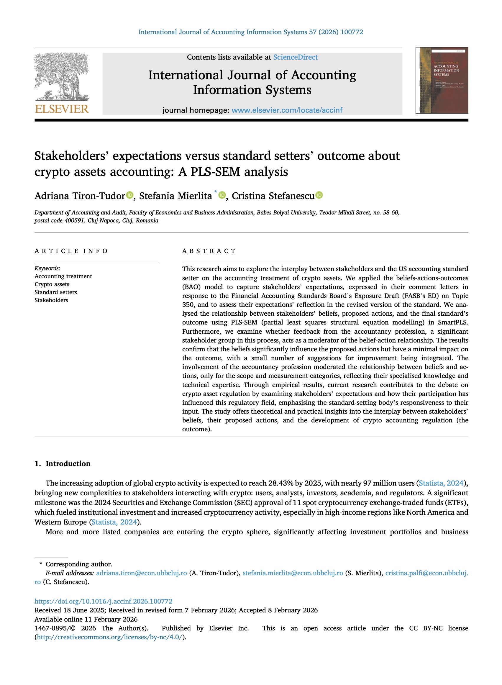 Tiron-Tudor A.; Mierlita S. & Stefanescu C. (2026) Stakeholders’ expectations versus standard setters’ outcome about crypto assets accounting: A PLS-SEM analysis. International Journal of Accounting Information Systems 57. 100772.